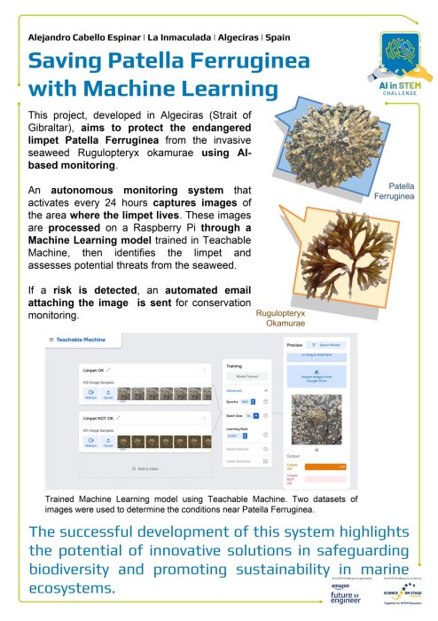 El proyecto destaca por su enfoque innovador en la conservación de la biodiversidad marina mediante el uso de la Inteligencia Artificial. El alumnado ha diseñado una estación autónoma de monitoreo capaz de proteger a la Patella Ferruginea, una especie de lapa en peligro de estinción, frente a la amenaza del alga invasora Rugulopteryx Okamurae, que afecta gravemente a los ecosistemas costeros del Parque Natural del Estrecho.