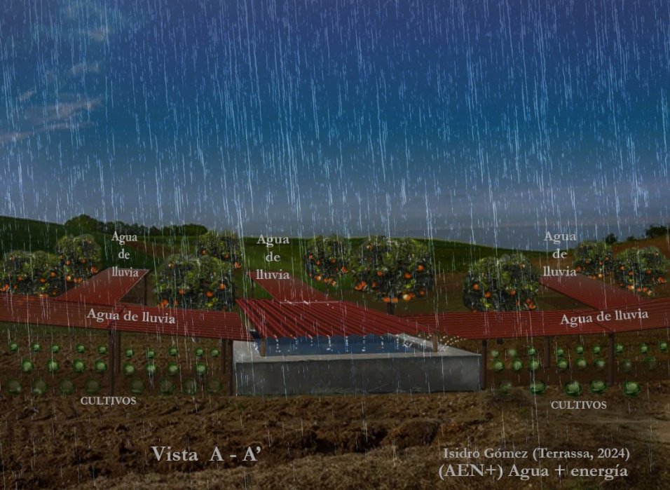 El agua puede recogerse desde tejados y desde instalaciones específicamente diseñadas, como las que se presentarán más adelante, tanto en campos de cultivo como, especialmente, en las miles de hectáreas ocupadas por plantas fotovoltáicas. Estas superficies permiten recoger millones de metros cúbicos de agua de lluvia, que posteriormente pueden destinarse al riego agrícola.