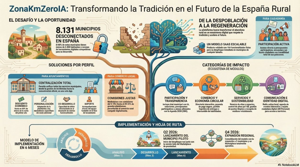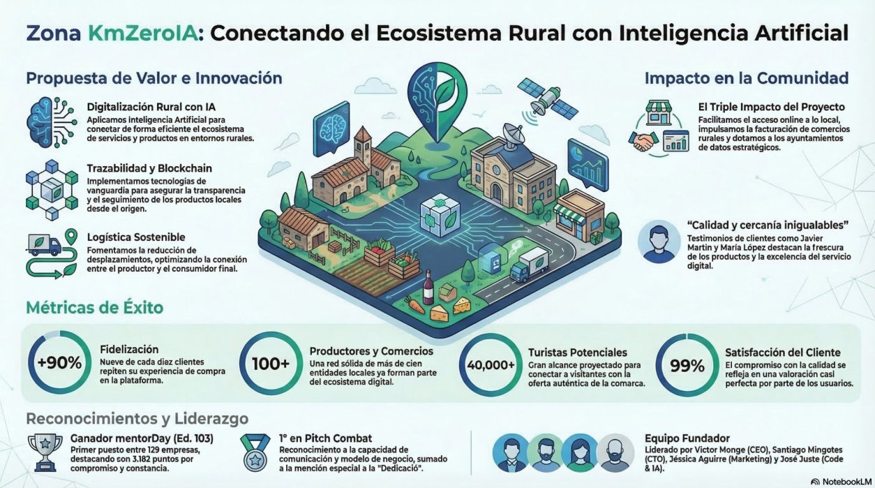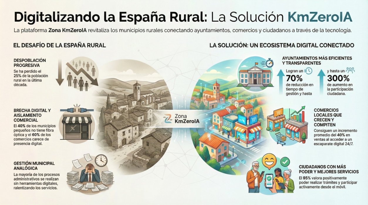 El proyecto nace como respuesta a los retos estructurales del medio rural: despoblación, envejecimiento de la población, brecha digital, escasez de recursos técnicos en los ayuntamientos y dificultades del comercio local y del turismo para adaptarse al entorno digital. Zona KmZeroIA no es una aplicación aislada, sino una infraestructura digital de territorio, pensada para generar impacto económico, social e institucional real y medible.
